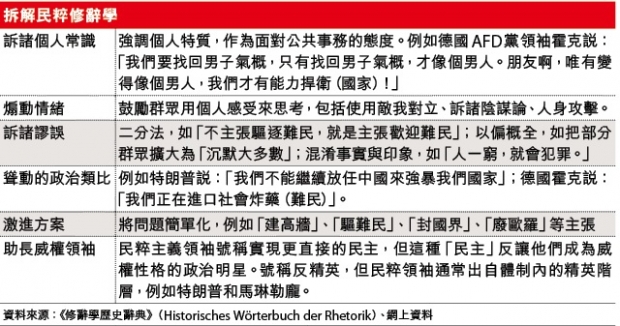 分析指,這意味着現有體制所建立的政治語言,對他們幾乎失去合法性。人們回歸私人領域的思考方式,去評價公共事務,趨向利己和保守;人權、環保、種族多元等「政治正確」的價值,被指陳義過高;自由、平等、民主等內涵被淘空,甚至被威權思想取代。這為右翼民粹主義政黨如AfD打開空間,政客利用民粹修辭〔見表〕,迎合「受傷的中產」,迅速獲得支持。