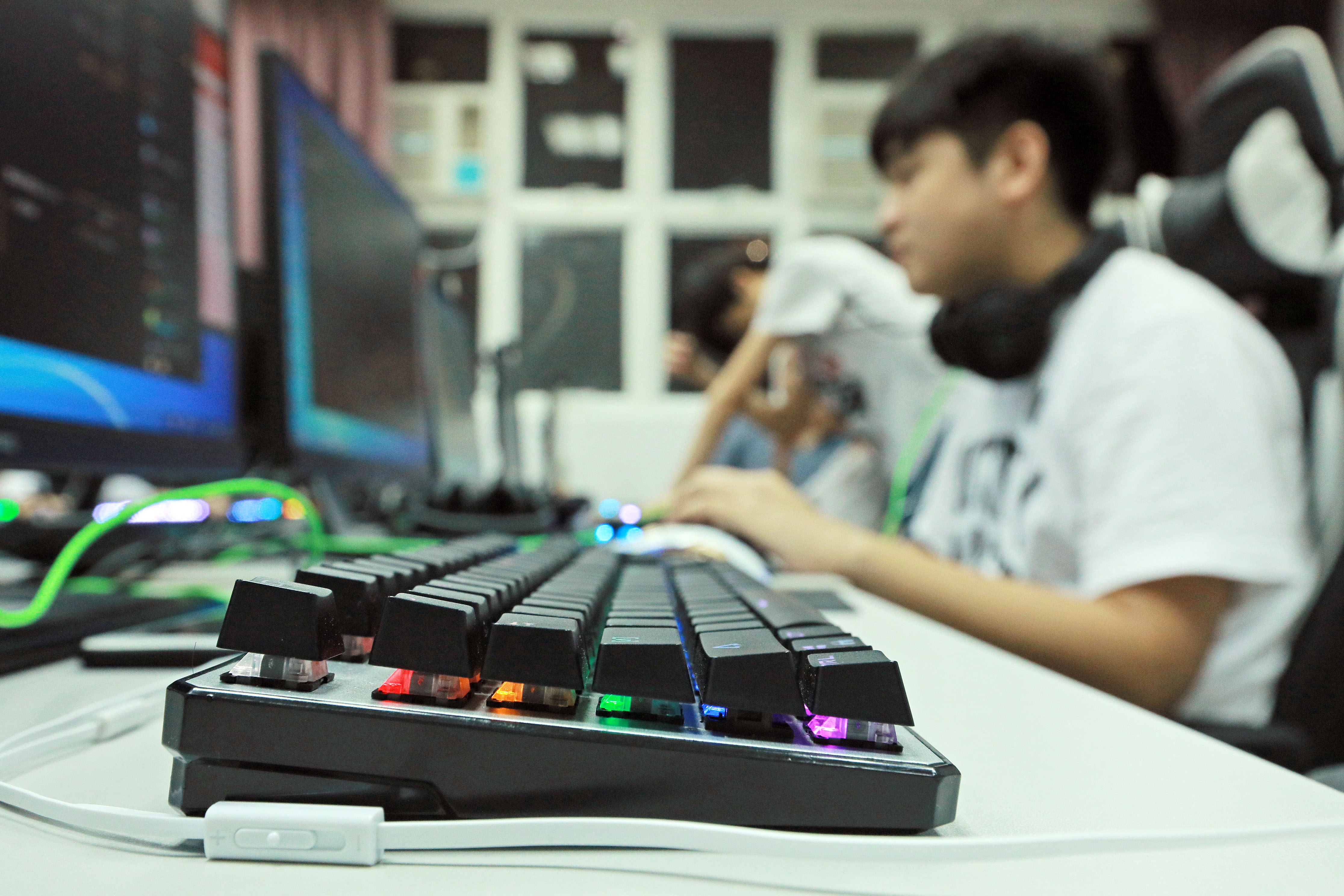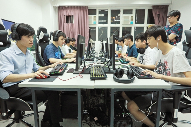 推門直入,300呎的單位無甚裝修,白牆白枱白光管,中央兩排電腦對放,按照電競「五對五」的對戰方式布陣。男生各就各位,把剛在便利店買的飲料擱在一旁,熟練地開機,開Skype(比賽時的通訊軟件),開《英雄聯盟》(LoL),有學員自備私伙鍵盤、滑鼠和耳機,俯身插掣。