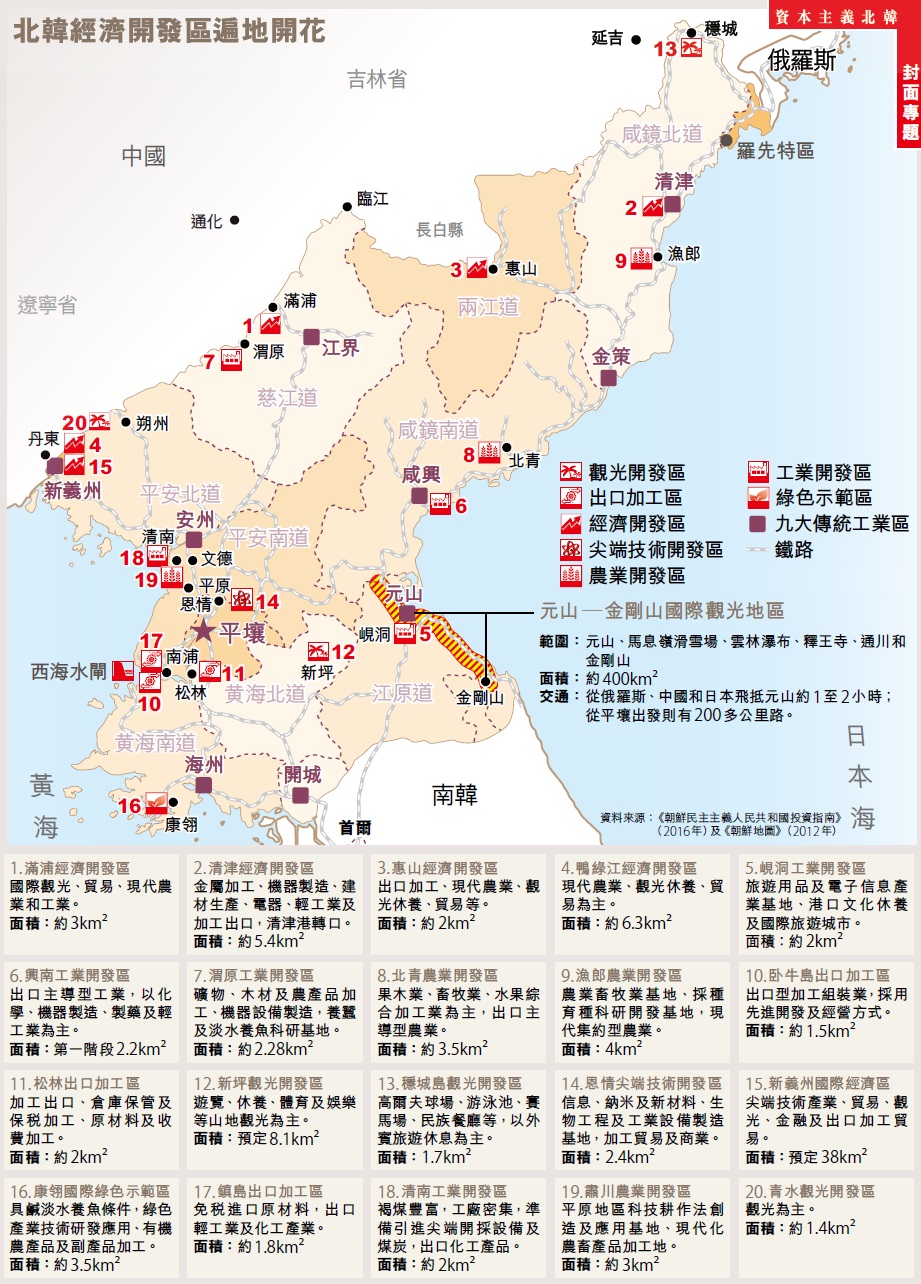 北韓早於2013年已出台政策,在全國八個道(省份)劃出13個經濟開發區,並根據各區條件發展不同產業;在2016年官方出版的《投資指南》中,開發區更增至20個,另設專章介紹「元山—金剛山國際觀光地區」〔見圖〕,並列出投資政策及相關訊息。