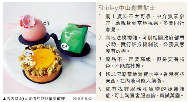 在一次偶然的機會下,她隨友人到中山旅遊,發現當地生活舒服,創業成本低,適合新手「試錯」,故決定放手一搏。「數千元已可租到很多不錯的鋪位。當地人工也低得驚人,時薪只是10元。」她和朋友以約20萬創業,「若在香港,可能需要200萬。」