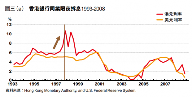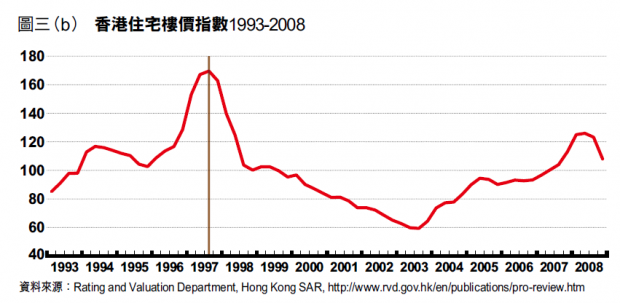三次房產泡沫爆破均涉加息周期其二是1997年的亞洲金融風暴,香港的樓價下跌了差不多七成,而香港因聯繫滙率的關係,自1994年起利率隨美國上升,由1993年第四季的3.63%上升至1995年第三季的6.19%,至1997年更抽上10%以上水平,房產泡沫隨後爆破〔圖三(a)、(b)〕。